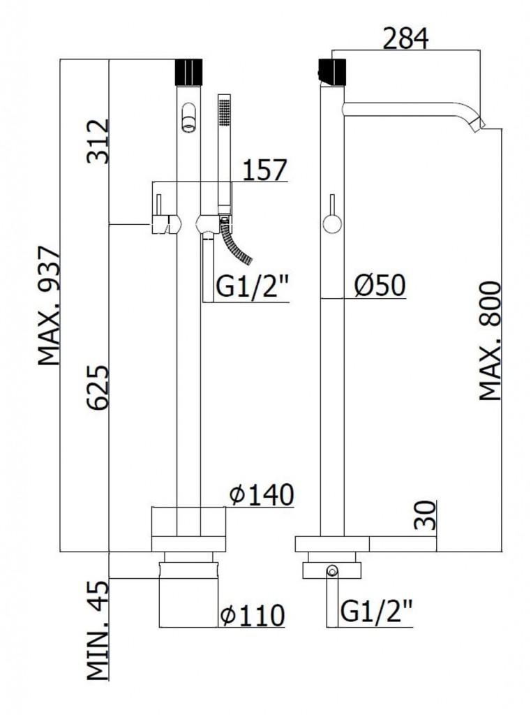 Vaňová páková batéria voľne stojaca na podlahe, s príslušenstvom, bez telesa