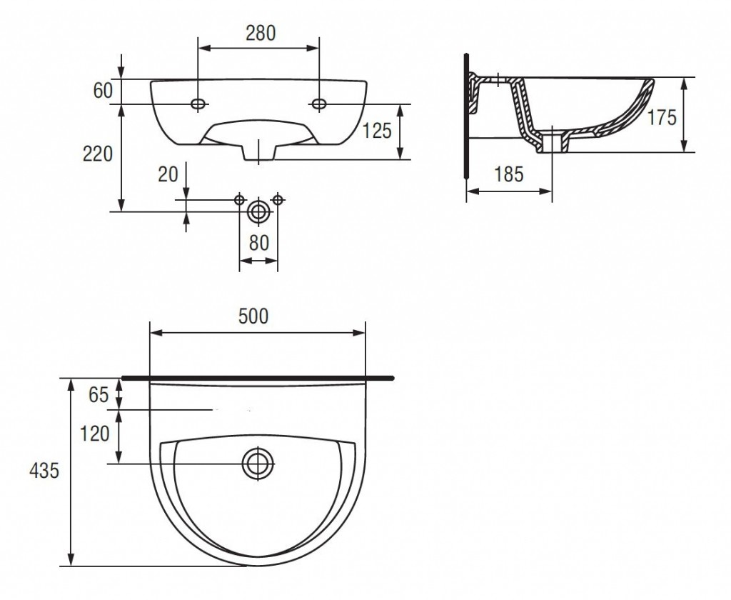 Závesné umývadlo PRESIDENT bez otvoru na batériu s prepadom. Možno inštalovať s ozdobným sifónom, s polostĺpom alebo stĺpom.