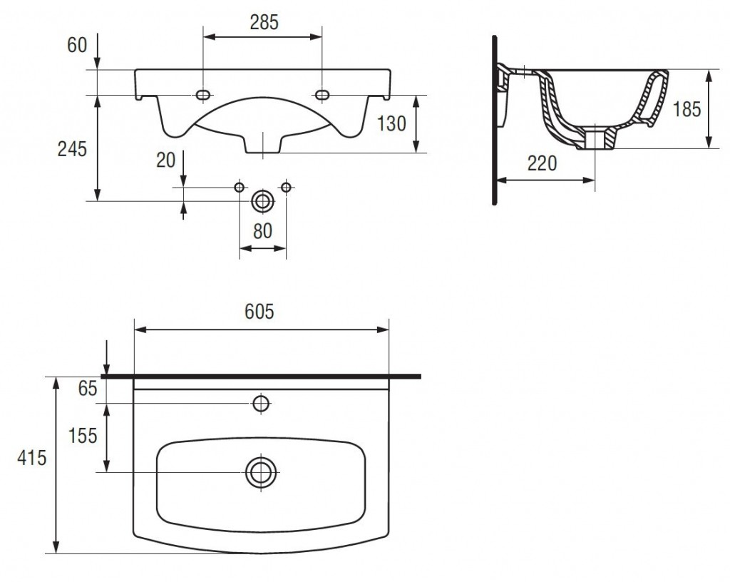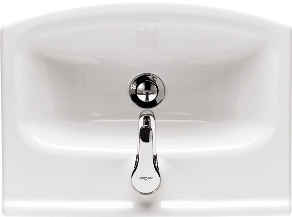 Nábytkové umývadlo Cersania NEW 60 s prepadom a otvorom na batériu. Je možné istalovat so skrinkou z radu BIANCO, FRIDA, LIMA, OLIVIA, Melara alebo inštalovať k stene s chrómovým sifónom.
