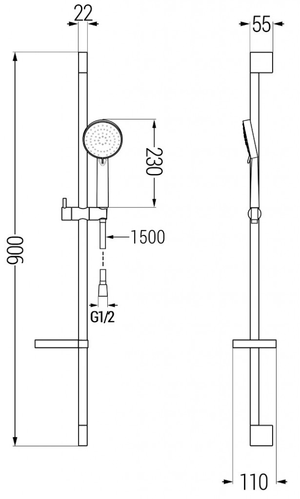 Rozmery držiaka sú: šírka lišty 22 mm, výška 900 mm a hĺbka od steny je 110 mm.
