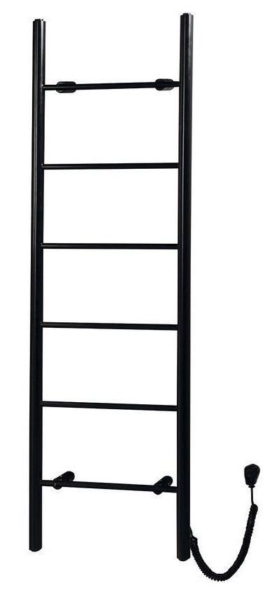 Elektrický sušák ručníků do moderního interiéru - v matně černé barvě jsou nejen trubky a uchycení, ale i napájecí kabel a elektrická zástrčka.