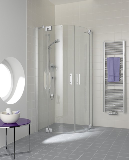 - Čiastočne rámový dvojkrídlový štvrťkruhový sprchovací kút s pevnými poľami, s dverami otváracími dovnútra aj von.