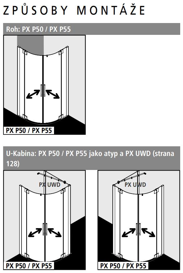| Charakter | Částečně rámový dvoukřídlý čtvrtkruhový sprchový kout s pevnými poli, s dveřmi otvíravými dovnitř i ven. |