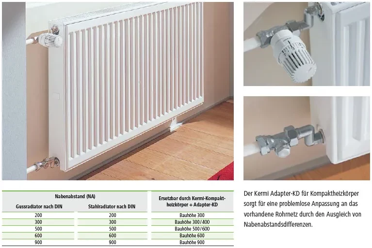 Adaptér KD vyrovná rozdiely v rozstupe pripojenia a umožní tak jednoduchú montáž telesa na pôvodnú rozvody.