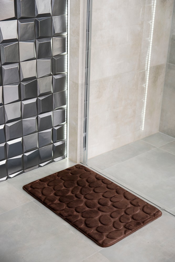 Kúpeľňový koberček v tmavej čokoládovej farbe vyrobený z mikrovlákna s trojrozmerným vzorom kameňa. Veľmi krátky vlas je hladký a extrémne ľahko sa čistí a vďaka jemnej hubovej výplni je koberec príjemný a mäkký na dotyk. Je vybavená protišmykovým dnom z PVC. Kúpeľňový koberček je možné prať v práčke na 30 stupňov. Nežehliť, chemicky nečistiť, nebieliť, nesušiť v sušičke.
