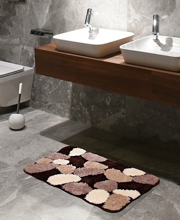 Kúpeľňová predložka z mikrovlákna príjemného na dotyk s nadýchaným vlasom. Má dekoratívne farby s motívom hnedého kameňa je vybavený protišmykovým dnom z PVC. sušičke.