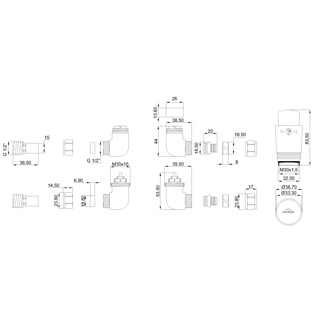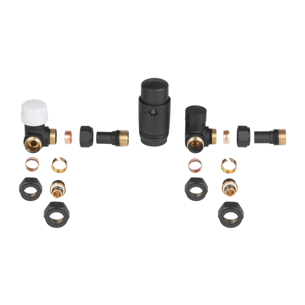 Na pripojenie kúpeľňového radiátora v medenom alebo PEX systéme, ľavom alebo pravom. Sada obsahuje: - 1/2" spojky radiátorov pre 15mm medené a 16mm PEX systémy, - termostatickú hlavicu M30x1,5, - prívodný a vratný ventil. Pre výmenu strán axiálnej sady (zľava doprava) odskrutkujte vložku zo spätného a prívodného ventilu, prehoďte strany a zašro.