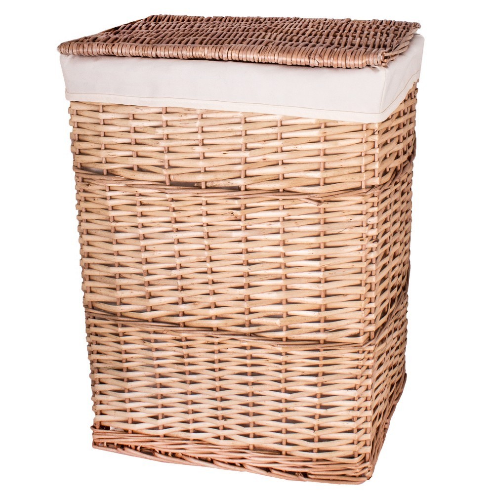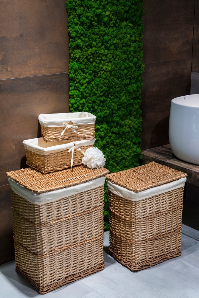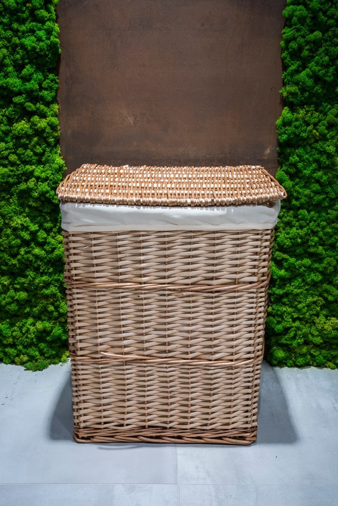 Veľký prútený kôš na bielizeň. Vnútro je podšité bavlneným plátnom. Má kryt pripevnený ozdobnými pásikmi podobnými koži.