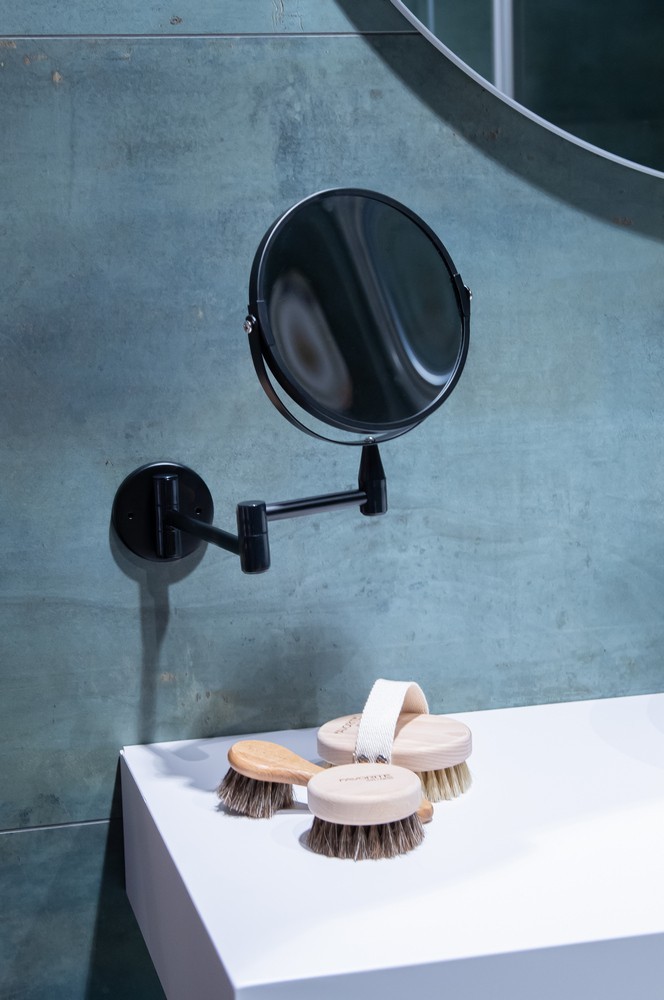 Zrkadlo s čiernym ramenom určené na montáž na stenu, ktoré šetrí miesto. podľa vašich potrieb Zrkadlo je tiež plne otočné, čo zvyšuje jeho univerzálnosť. Na druhej strane zrkadla je dvojnásobné zväčšenie obrazu, ktoré sa skvele hodí pre precíznu starostlivosť alebo líčenie.