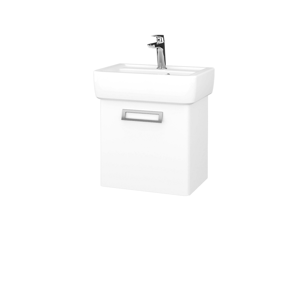 Závesná kúpeľňová skrinka DOOR SZD 45 v dverovom prevedení s keramickým umývadlom RENOVA. Dvierka skrinky majú praktickú pochrómovanú úchytku. Vnútro skrinky poskytuje dostatočný priestor pre uloženie vyšších predmetov (napríklad pracích prostriedkov). Vďaka svojím menším rozmerom sa skrinka s malým umývadlom hodí do panelákových kúpeľní či na samostatné toalety.