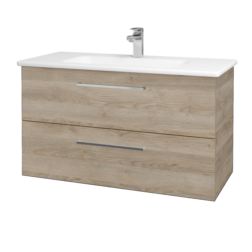Kúpeľňová skrinka GIO SZZ2 100 v závesnom prevedení je vybavená dvoma priestornými zásuvkami. Skrinka je osadená keramickým s priestornou odkladacou plochou.