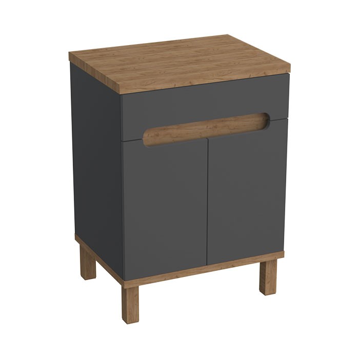 | Popis: | • kúpeľňová skrinka pod doskové umývadlo • moderná kombinácia lakovaných plôch v šedej (lávovej) farbe a doplnkov v dekore zlatý dub • 2 x dvierka s tichým dovieraním Soft-Close s frézovanými madlami • vo vnútri skrinky je umiestnená 1 výškovo nastaviteľná polica z LTD bielej farby • skrinka je doplnená hornou doskou hrúbky 25 mm v dekore zlatý dub, na ktorú je možné inštalovať doskové umývadlo (doska nemá otvor pre umývadlový sifón) • na ustavenie na podlahu slúžia podporné nôžky z MDF s povrchovou úpravou fóliou v dekore zlatý dub • UMÝVADLO NIE JE SÚČASŤOU NÁBYTKU |
