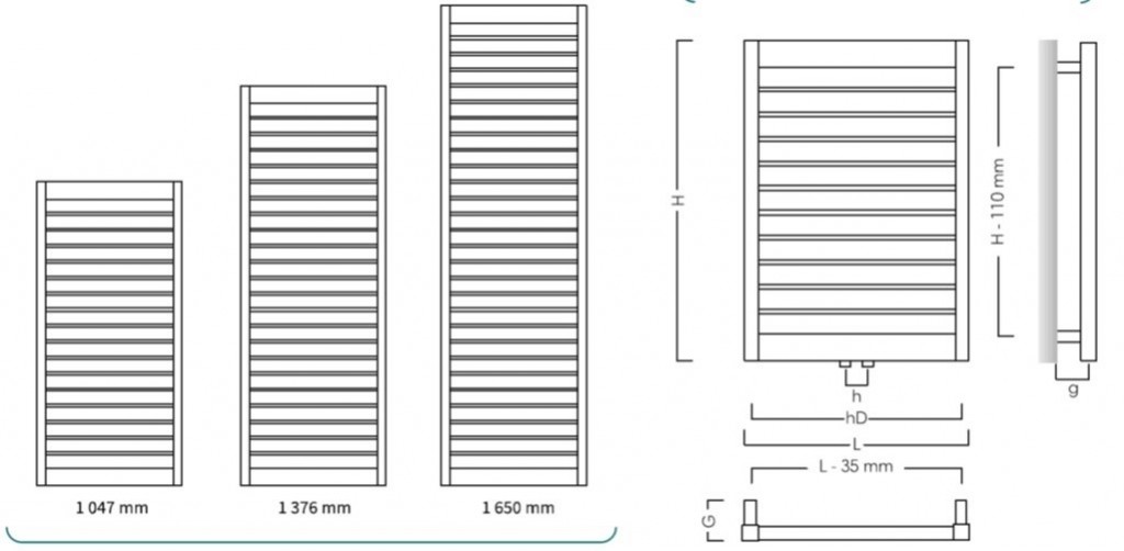 - 400 × 1650 mm, výkon 652 W (vykurovacia tyč 600 W)