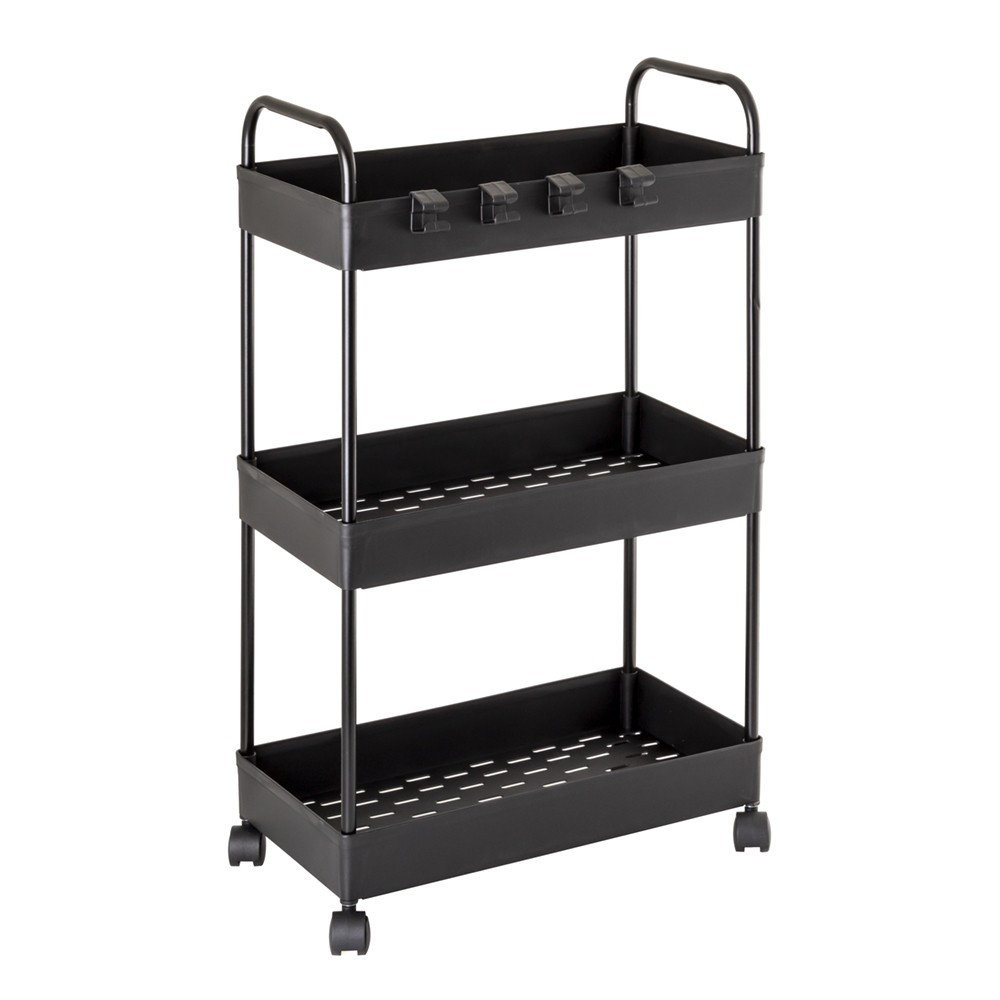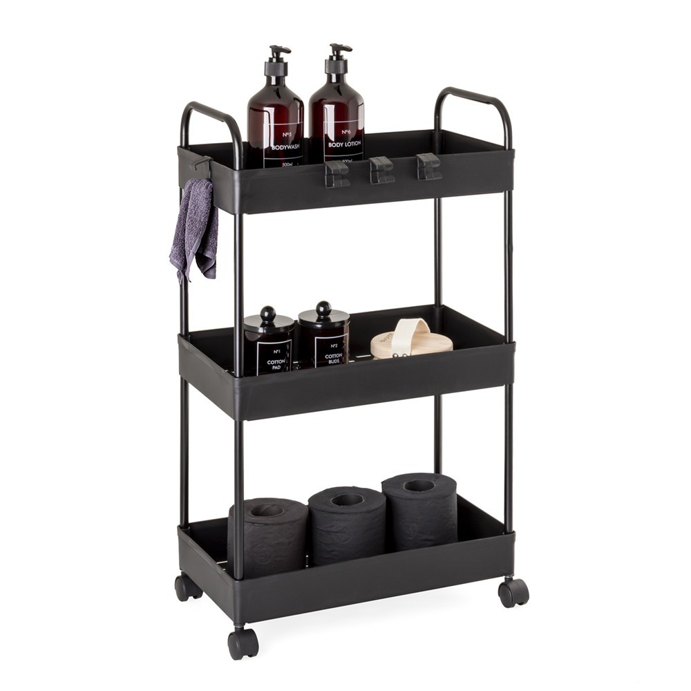 Čierna polica vyrobená z odolného plastu je všestranným riešením, ktoré dobre funguje v každej miestnosti. Jeho robustný kovový rám poskytuje stabilitu a odolnosť, zatiaľ čo namontované kolesá zaisťujú mobilitu, takže sa v prípade potreby ľahko premiestnia. Polička, vybavená tromi košíkmi, umožňuje efektívne ukladanie a organizáciu predmetov v kúpeľni, kuchyni alebo iných priestoroch. Navyše štyri praktické háčiky, ktoré je možné pripevniť a premiestniť na police podľa potreby, ponúkajú flexibilné prispôsobenie tak, aby vyhovovali individuálnym požiadavkám. Polička sa výnimočne ľahko montuje a nevyžaduje žiadne nástroje - jednoducho postupujte podľa priloženého návodu.