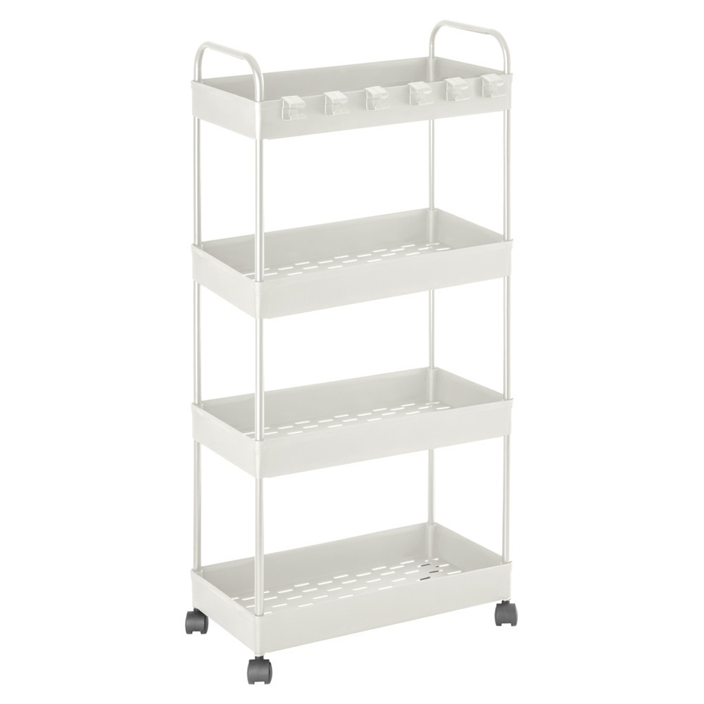 Popis: Biela regálová jednotka z odolného materiálu je praktickým a estetickým riešením do každej miestnosti. Jeho robustný kovový rám zaisťuje stabilitu a odolnosť, zatiaľ čo pripojené kolieska umožňujú ľahkú mobilitu podľa vašich potrieb. Je vybavená 4 priestrannými košíkmi a poskytuje pohodlné skladovanie a organizáciu vecí v kúpeľni, kuchyni alebo iných priestoroch. Ďalšou výhodou je 6 odnímateľných háčikov, ktoré je možné ľubovoľne rozmiestniť na policiach a optimalizovať tak využitie priestoru. Policový diel sa ľahko zostavuje - zostavenie komponentov podľa priložených pokynov nevyžaduje žiadne nástroje, takže je perfektnou voľbou pre tých, ktorí oceňujú pohodlie a funkčnosť.