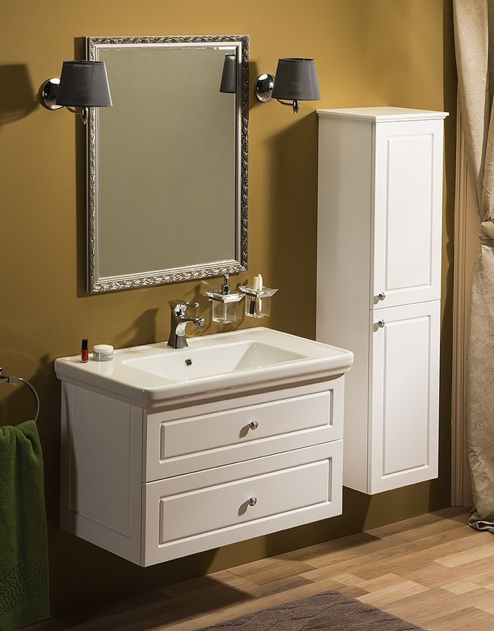 Skrinky VIOLETA vo vintage štýle s plastickým dekorom, doplnené úchytkou s kryštálom sú v bielom pololesklom prevedení. Skrinku pod umývadlo dopĺňa k eramické umývadlo CLASSIC od talianskeho výrobcu GSI, opatrené glazúrou extraglaze®, ktorá sa aplikuje počas výrobného cyklu pred vypálením, čím je zaručený jej trvalý účinok. Extraglaze® dodáva keramike dokonale hladký povrch, vysoký lesk a ochranu proti vápenným usadeninám. Keramika je tak žiarivo biela a ľahko čistiteľná. Nepostrádateľnou súčasťou zostavy je zrkadlo DAHLIA v drevenom ráme s plastickým motívom listov, ktoré vkusne dopĺňa skrinky.