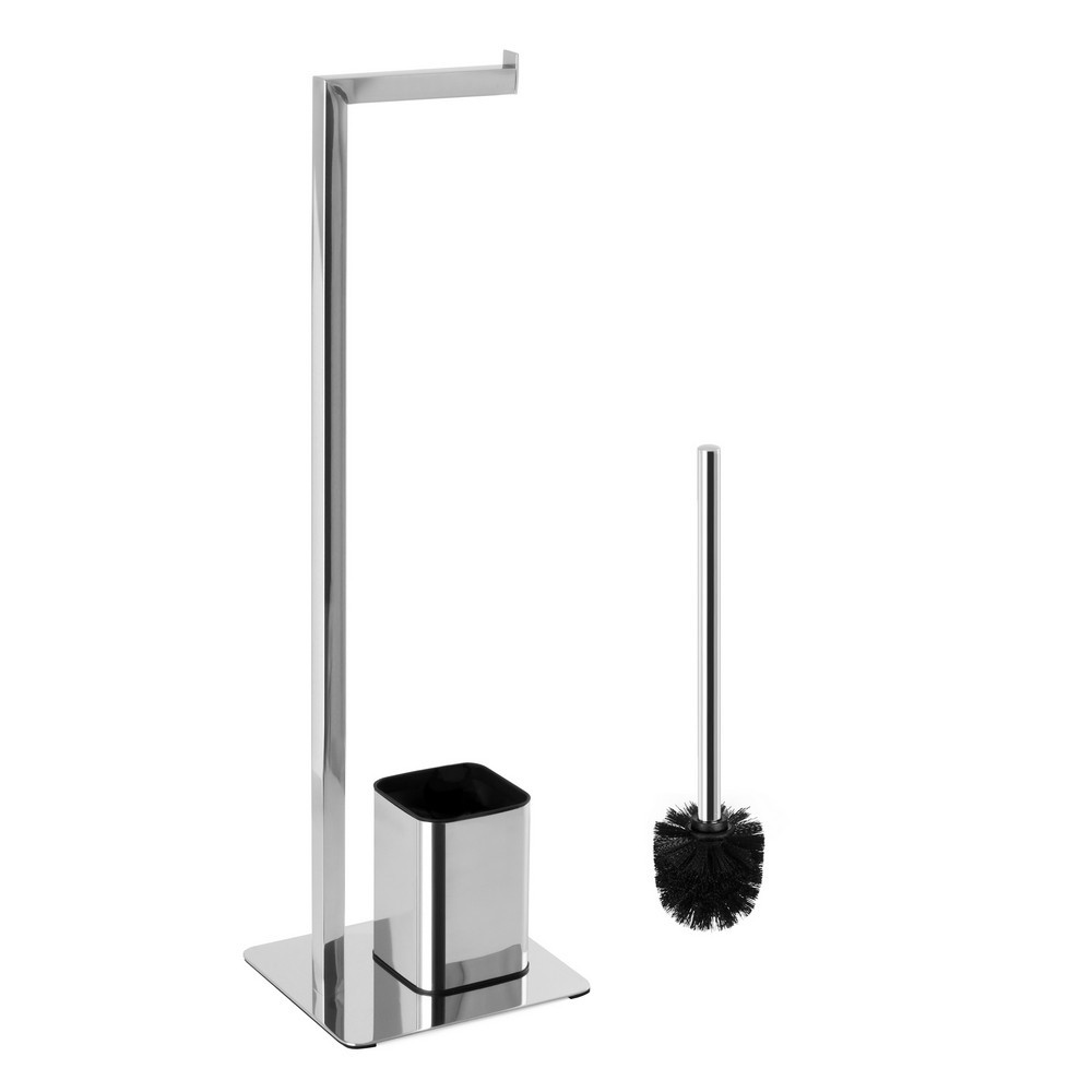 Chrómový kúpeľňový stojan s geometrickým tvarom je moderným a funkčným riešením do každej kúpeľne. Vyrobené z odolnej pochrómovanej ocele, vyniká štvorcovým a minimalistickým, elegantným dizajnom. Jeho jednoduché geometrické línie dodávajú priestoru moderný nádych. Stojan zahŕňa držiak na toaletný papier a štvorcový držiak na WC kefu. Štvorcová základňa je opatrená plastovými nožičkami, ktoré zabraňujú poškriabaniu, a držiak WC štetky obsahuje vyberateľnú vložku pre ľahké čistenie. Je to perfektná voľba pre tých, ktorí ocenia moderný, geometrický dizajn.