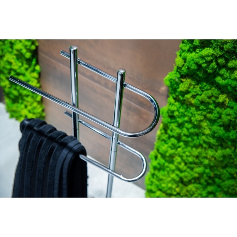 Kúpeľňový vešiak MOON je báječný pomocník. Už nemusíte náročne rovnať svoje uteráky do skrine, alebo prácne prirábať vešiaky do steny. Stačí mať doma náš voľne stojaci vešiak, ktorý sa vďaka svojmu tvaru dá pekne umiestnený vedľa steny. Konštrukcia sa vyrába z chrómovanej ocele. Nášho "nemého sluhu" si určite obľúbite pre jeho praktickosť. Dodávané v demonte.