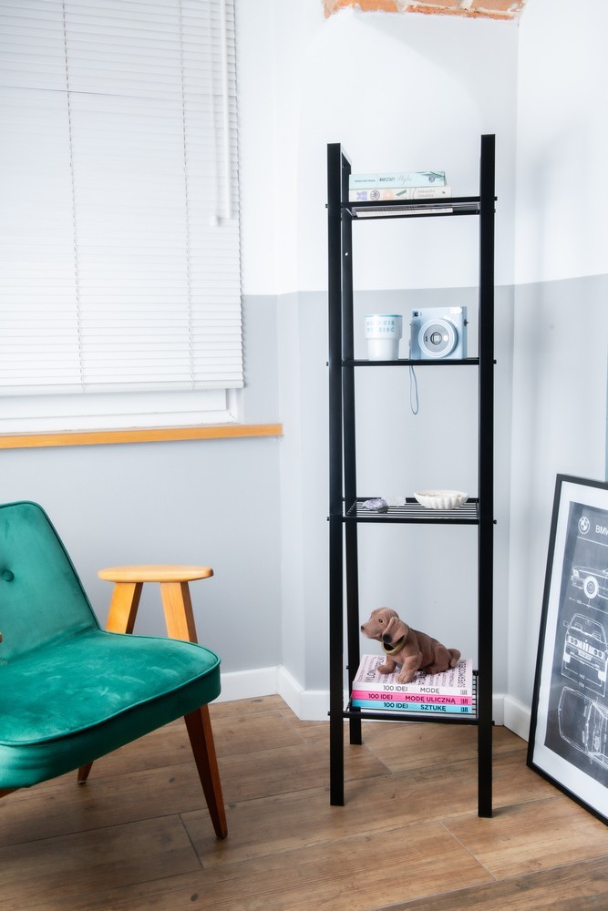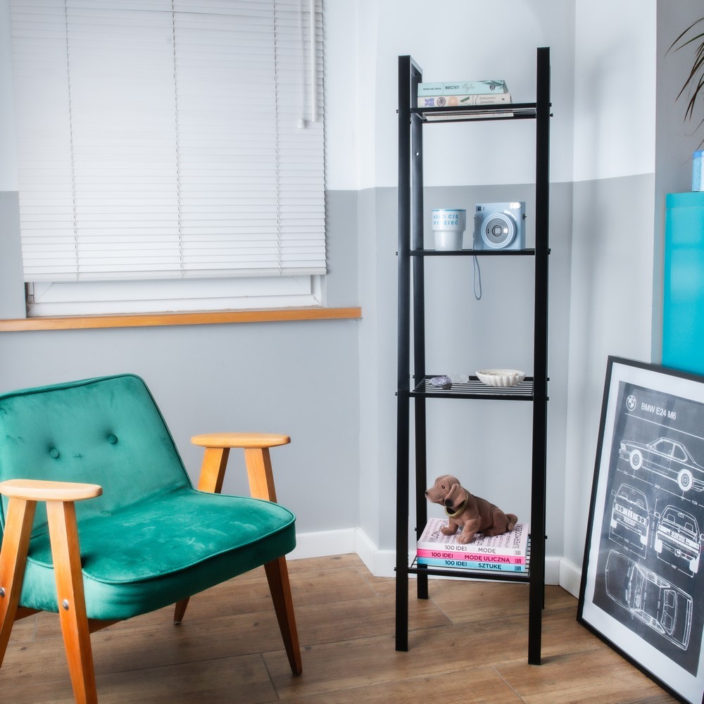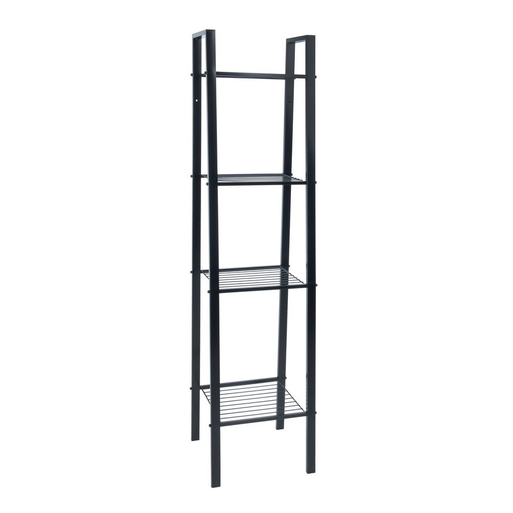 Úzka polica so štyrmi policami zo širokého drôtu. Je vyrobená z čierno lakovanej ocele. Bude ideálnym riešením na uloženie a vystavenie rôznych predmetov v kúpeľni, obývacej izbe alebo na akomkoľvek inom mieste vo vašej domácnosti. Táto úzka polica ponúka veľkú kapacitu a pevnú konštrukciu zaručujúcu nielen funkčnosť, ale aj estetický vzhľad. Vyžaduje vlastnú montáž.