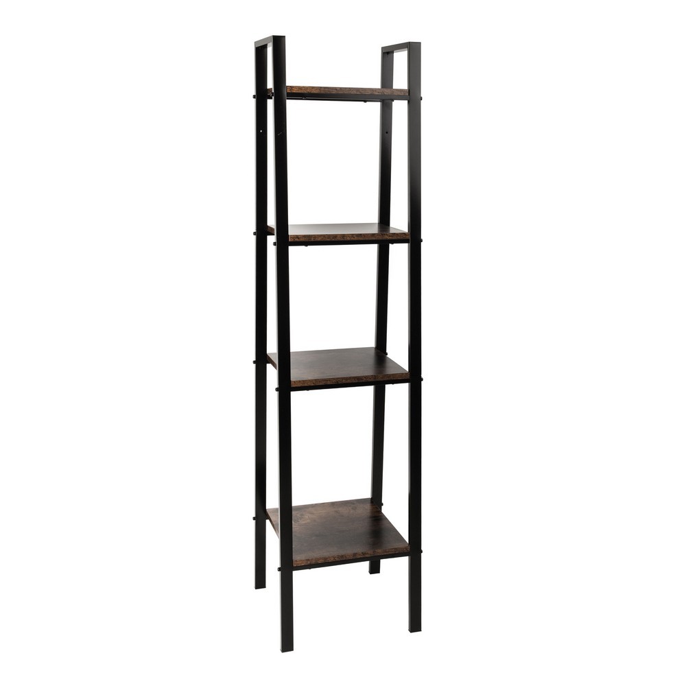 Úzka polica so štyrmi policami z MDF dosky potiahnuté krásnou pálenou drevenou dyhou. Je vyrobená z čierno lakovanej ocele. Bude ideálnym riešením na uloženie a vystavenie rôznych predmetov v kúpeľni, obývacej izbe alebo na akomkoľvek inom mieste vo vašej domácnosti. Táto úzka polica ponúka veľkú kapacitu a pevnú konštrukciu zaručujúcu nielen funkčnosť, ale aj estetický vzhľad. Vyžaduje vlastnú montáž.