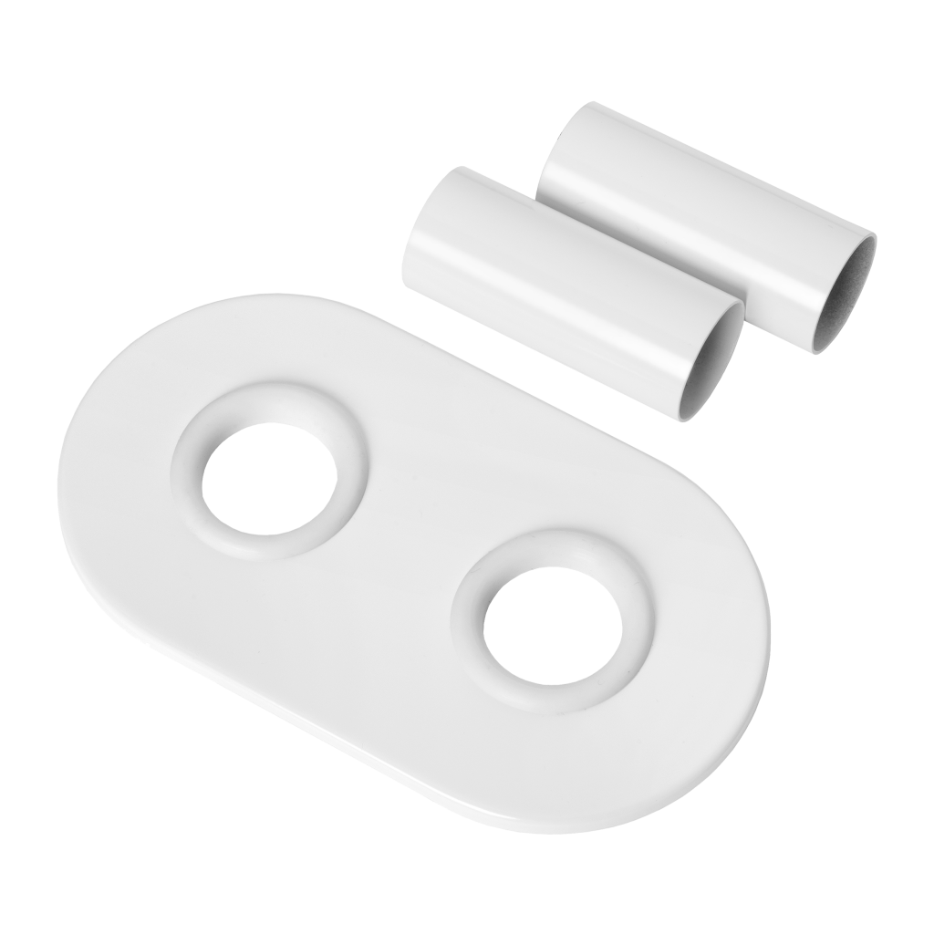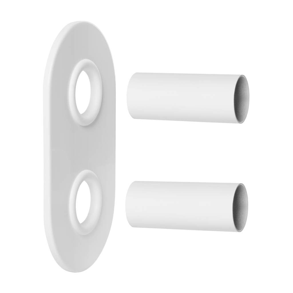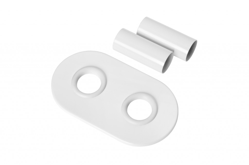 Set krycej dvojitej oválnej rozety s dvoma otvormi a objímkami na radiátor je sada, ktorá sa používa na zakrytie spojov medzi radiátorom a prívodným potrubím, čím zaisťuje estetický vzhľad a bezpečné upevnenie radiátora. Sada je vo farebnom bielom vyhotovení.