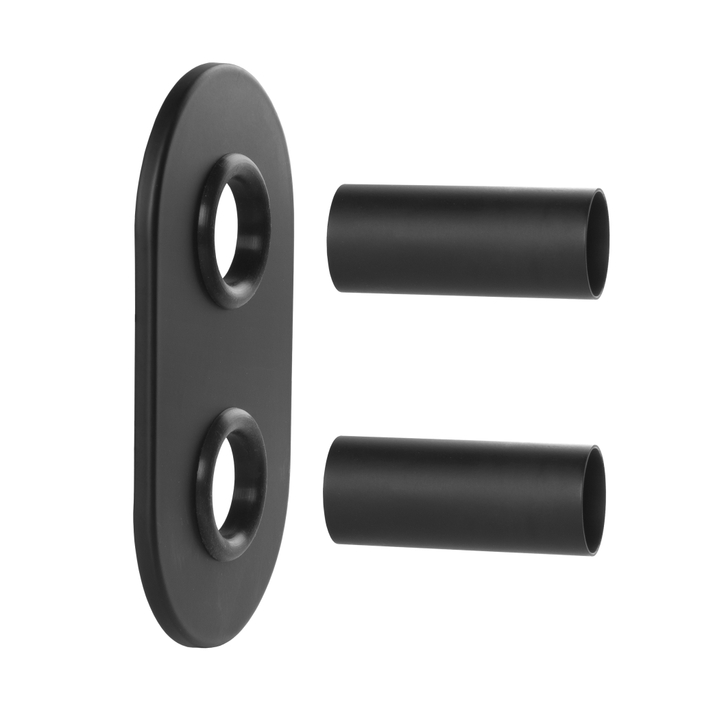 Set krycej dvojitej oválnej rozety s dvoma otvormi a objímkami na radiátor je sada, ktorá sa používa na zakrytie spojov medzi radiátorom a prívodným potrubím, čím zaisťuje estetický vzhľad a bezpečné upevnenie radiátora. Sada je vo farebnom čiernom prevedení.