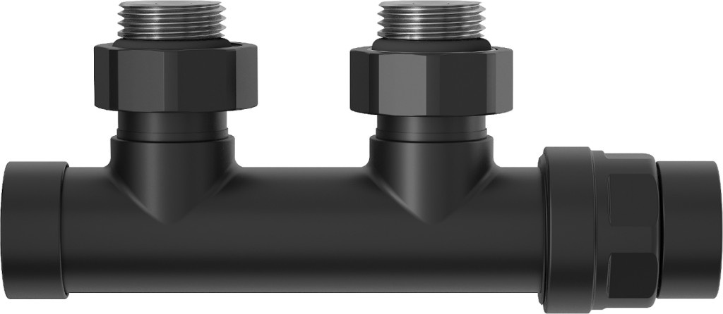 Uni-term, uhlový ventil pre radiátor s rozstupom 50mm , obojstranný. Tento typ pripojenia je navrhnutý tak, aby sa pripájal k radiátoru v strede jeho spodnej časti . Výhodou stredového pripojenia je, že poskytuje čistejší a estetickejší vzhľad, pretože potrubie je menej viditeľné a je ľahšie ho integrovať do designu miestnosti.