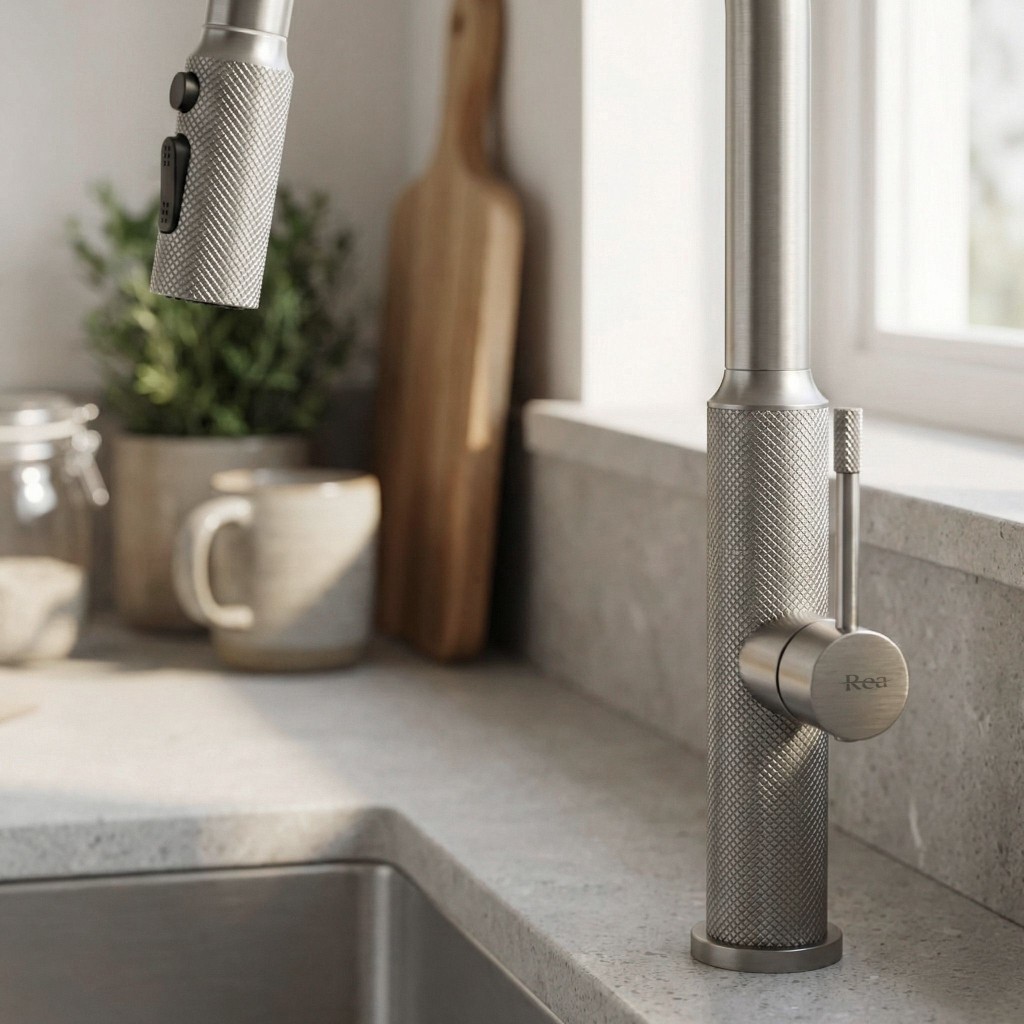 Zvýšte funkčnosť a moderný štýl svojej kuchyne vďaka kuchynskej batérii Rea Master. Tento model spája industriálny design s pokročilou technológiou. Je vyrobený z masívnej mosadze a má povrch v odtieni kartáčovaného niklu, čo z neho robí odolné a estetické riešenie pre náročných užívateľov. Povrch Brushed Nickel – batéria je opatrená PVD vrstvou vo farbe kartáčovaného niklu. Táto technológia zaisťuje vysokú odolnosť proti poškriabaniu a zmatneniu a saténový povrch uľahčuje údržbu. Výsuvná výtoková hubica - pohyblivá hubica na flexibilnú hadicu je kľúčom k pohodliu v kuchyni. Umožňuje ľahké umývanie veľkého riadu, oplach drezu aj napúšťanie vysokých hrncov na pracovnej doske. Prepínanie prúdu vody – ergonomický prepínač na hubicu umožňuje okamžitú zmenu režimu: z koncentrovaného nepretržitého prúdu na rozptýlený sprchový prúd, ideálny pre okonštruovanie z ovocia a zeleniny. Mosadzné telo – armatúry.Dekoratívne vrúbkovanie – typickým prvkom modelu Master je diamantová štruktúra na páke a koncovke hubica. Protišmykové prevedenie dodáva technický vzhľad a uľahčuje ovládanie mokrou rukou. Batéria Rea Master Nickel je skvelou voľbou do moderných a loftových kuchýň. Jej surové, „oceľové“ sfarbenie a vysoká funkčnosť zjednodušujú každodenné činnosti a dodávajú umývacej zóne profesionálny vzhľad.