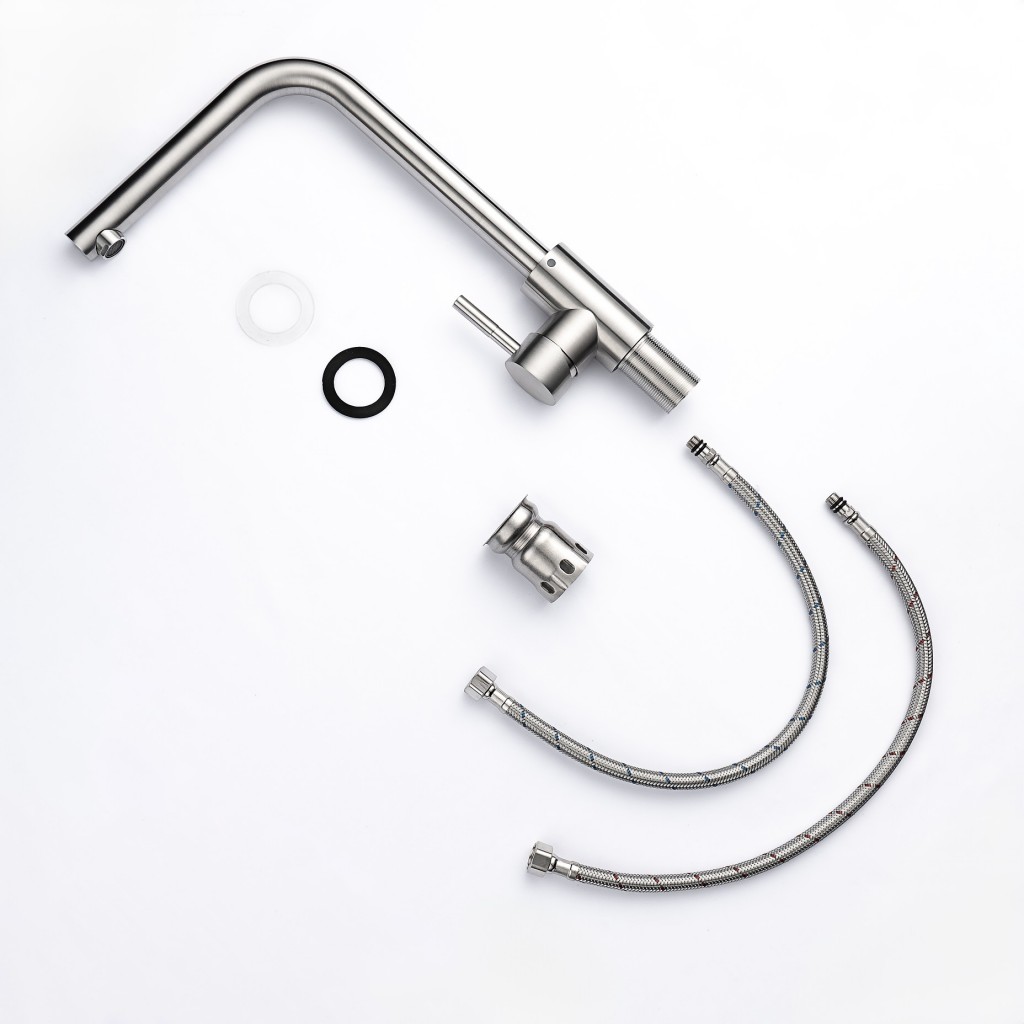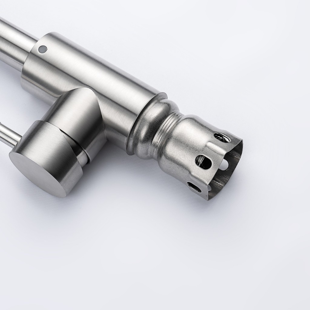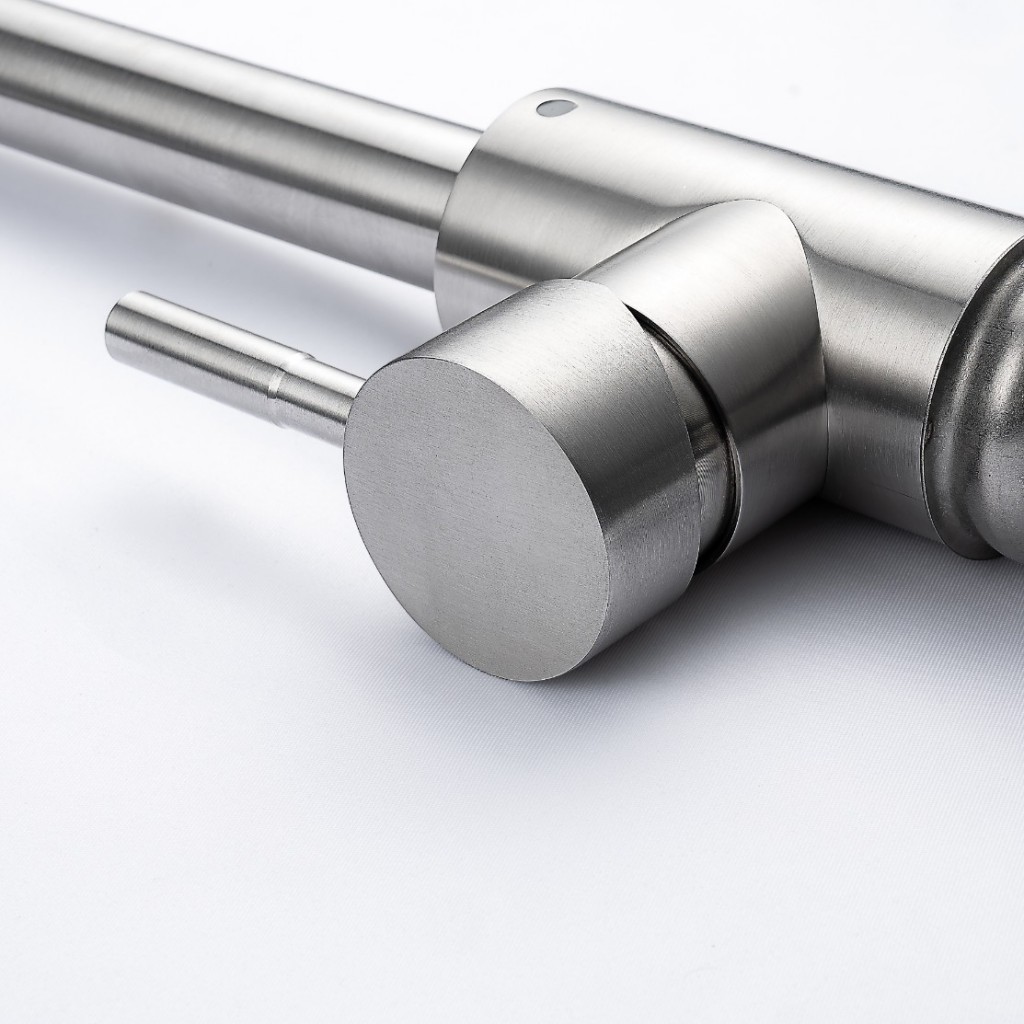 Moderná kuchynská batéria v tvare L je praktickým a štýlovým doplnkom každej kuchyne. Vyrobená z kvalitnej mosadze s povrchovou úpravou vo farbe nerezovej ocele ponúka dlhú životnosť a jednoduchú údržbu.