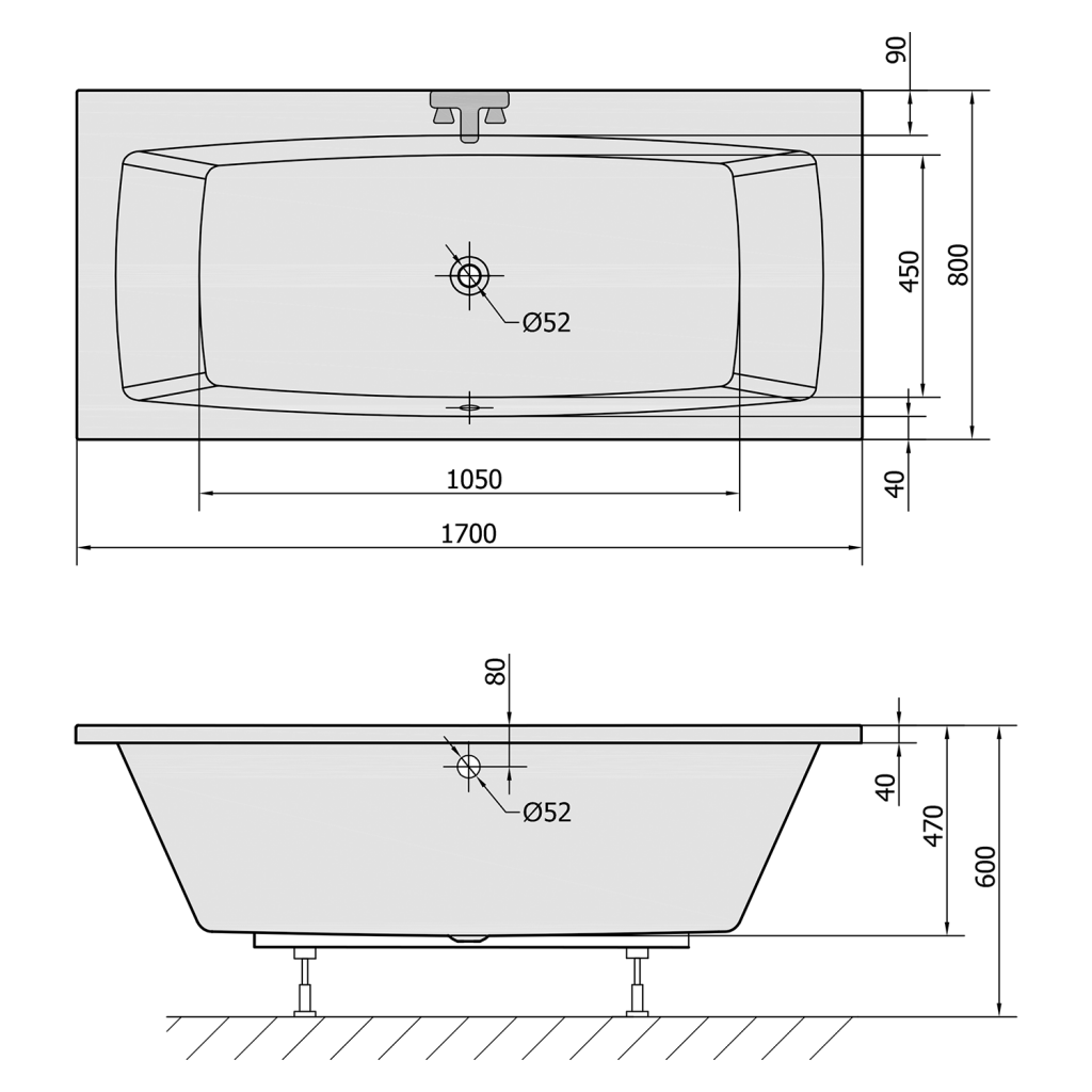 Vaňa s pohodlne tvarovanými stenami na opretie chrbta na oboch stranách a odtokom umiestneným uprostred.