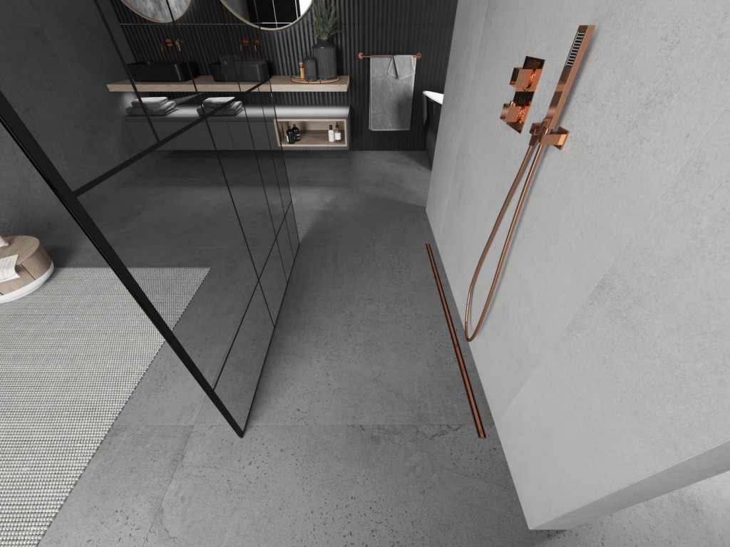 Walk-in sprchová zástena KIOTO 100 x 200 cm, 8 mm - číre sklo s čiernym vzorom, ružovo zlaté vzpery