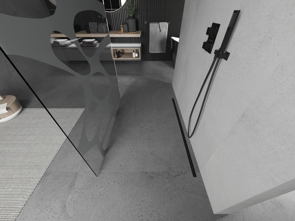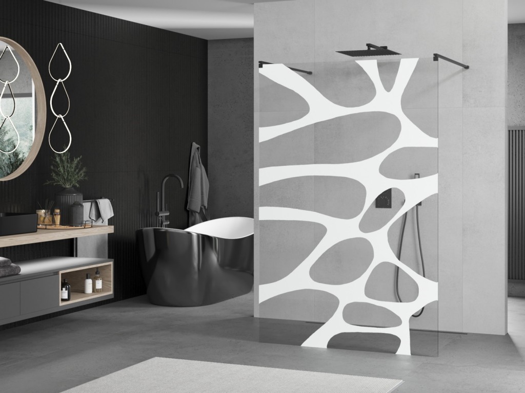 Walk-in sprchová zástena KIOTO 120 x 200 cm, 8 mm - číre sklo s bielym dekorom, čierne vzpery