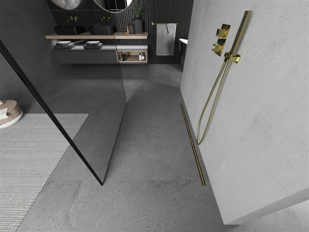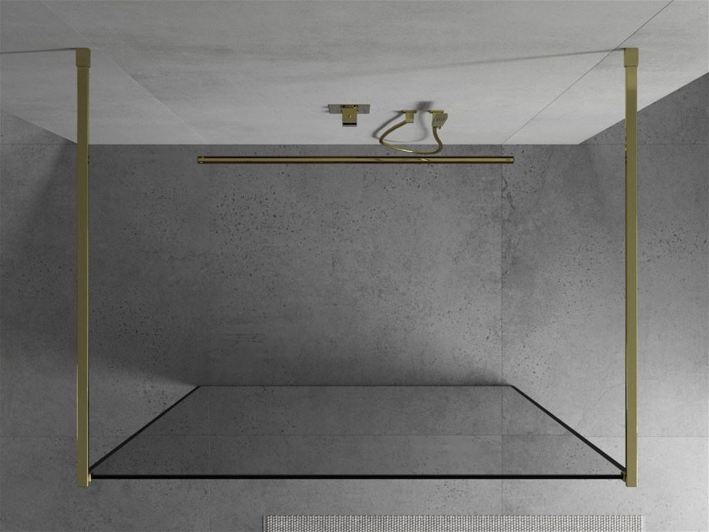 Walk-in sprchová zástena KIOTO 130 x 200 cm, 8 mm - číre sklo s čiernym vzorom, zlaté vzpery