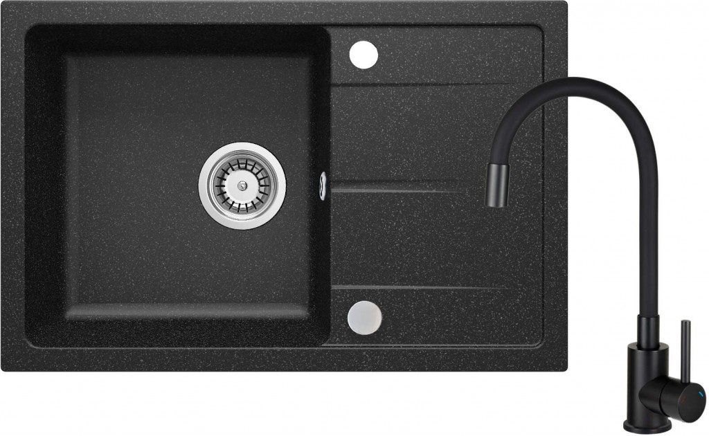 Granitový drez s batériou tvorí kompletnú kuchynskú zostavu. Drez bol vyrobený z odolnej prírodnej žuly, ktorá je odolná nielen voči vysokej teplote a jej výkyvom, ale aj nárazom a zmene farby, v súlade s európskou normou PN-EN 13310. Navyše je obohatená o hydrofóbnu vrstvu, ktorá uľahčuje tok jednotlivých kvapiek. Prepad v mise drezu chráni pracovnú dosku a kuchyňu pred zatopením. Prebytočná voda je efektívne odvádzaná do sifónu. V rovnakej farbe je aj vodovodná batéria s pohodlnou výlevkou. Ide o model s praktickým, flexibilným výtokom.
