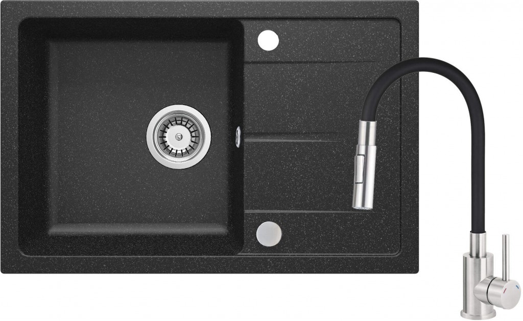 Žulový drez s batériou tvorí kompletný kuchynský set. Vyrobený z odolnej prírodnej žuly, je odolný nielen voči vysokým teplotám a výkyvom, ale aj voči nárazom a zmene farby, v súlade s európskou normou PN-EN 13310. Je tiež obohatený o hydrofóbny povlak, ktorý uľahčuje odtok jednotlivých kvapiek. Zakrivený výtok batérie si zachováva svoj tvar, čo umožňuje jeho nastavenie v ľubovoľnom smere, čo uľahčuje oplachovanie veľkých a objemných predmetov, ako sú plechy v rúre alebo police v chladničke.