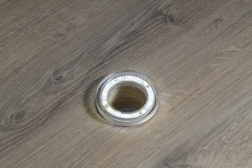 Světelný kroužek má na obou stranách průhledné těsnění a jednoduše se instaluje na odpad umyvadla. Je vyroben z průhledného akrylátu a vyzařuje světlo směrem do umyvadla a pod umyvadlo.