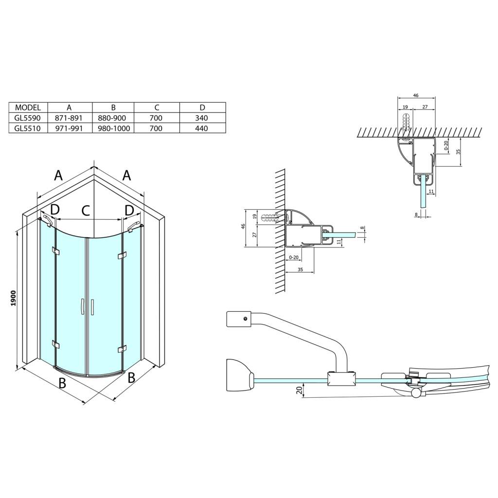 - Je možné vyrobiť aj pevné časti štvrťkruhového sprchového kúta, že vznikne atypický štvrťkruh s rozmermi 1000x800 a 1200x900 mm
