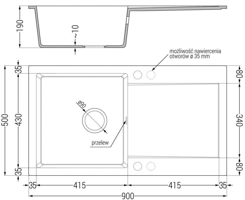 - odtokový otvor: 3,5 ”; fi = 90 mm