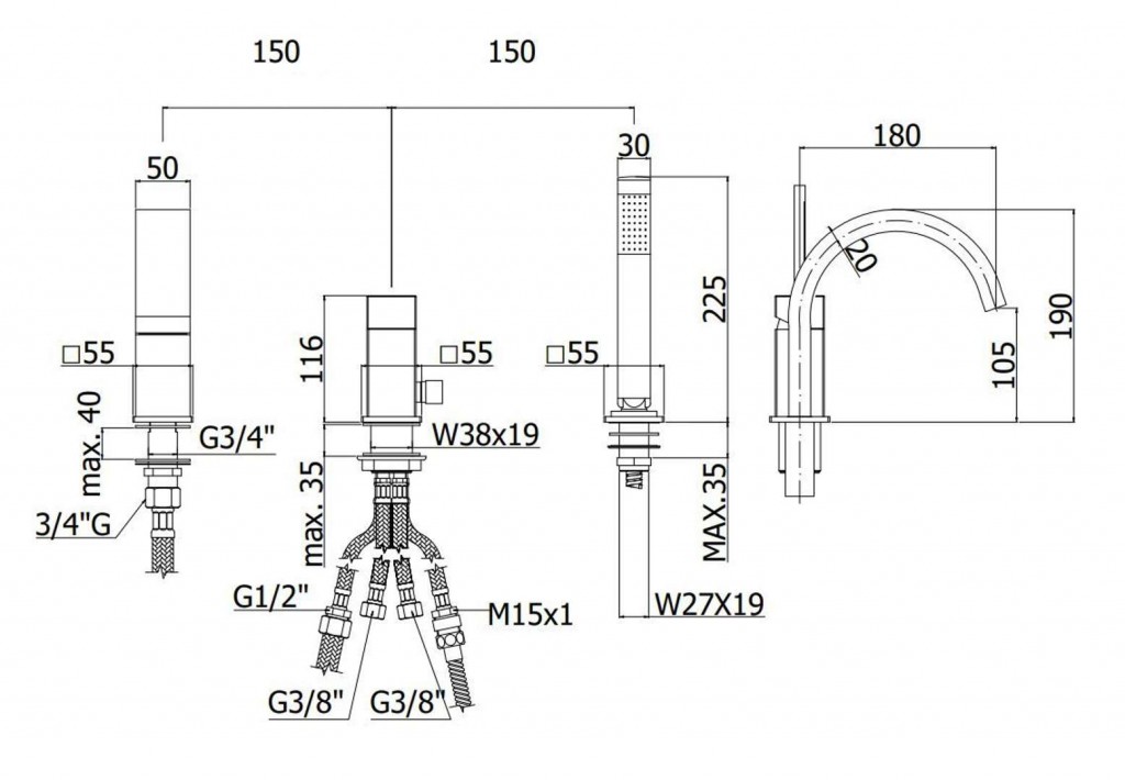 - výška vaňového výtoku 190 mm