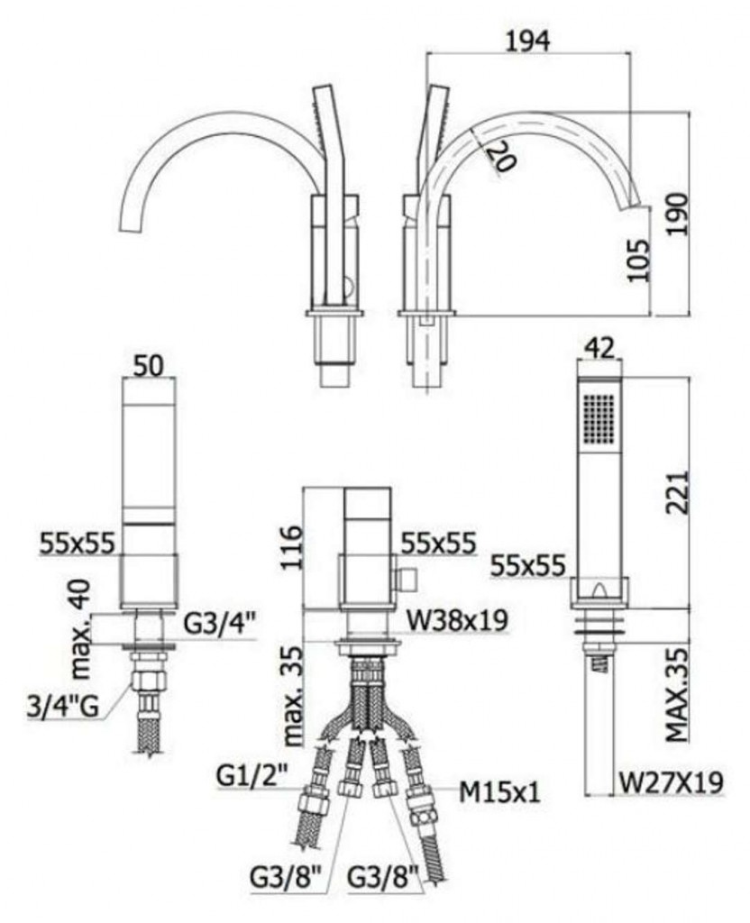 - výška vaňového výtoku 190 mm