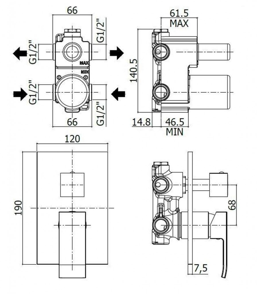 Sprchová páková batéria s otočným prepínačom vrátane podomietkového telesa pre 2 vývody