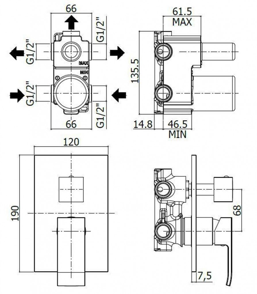 Sprchová páková batéria s otočným prepínačom vrátane podomietkového telesa pre 3 vývody