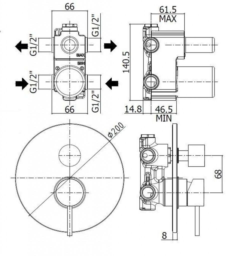 Sprchová páková batéria s otočným prepínačom vrátane podomietkového telesa pre 2 vývody
