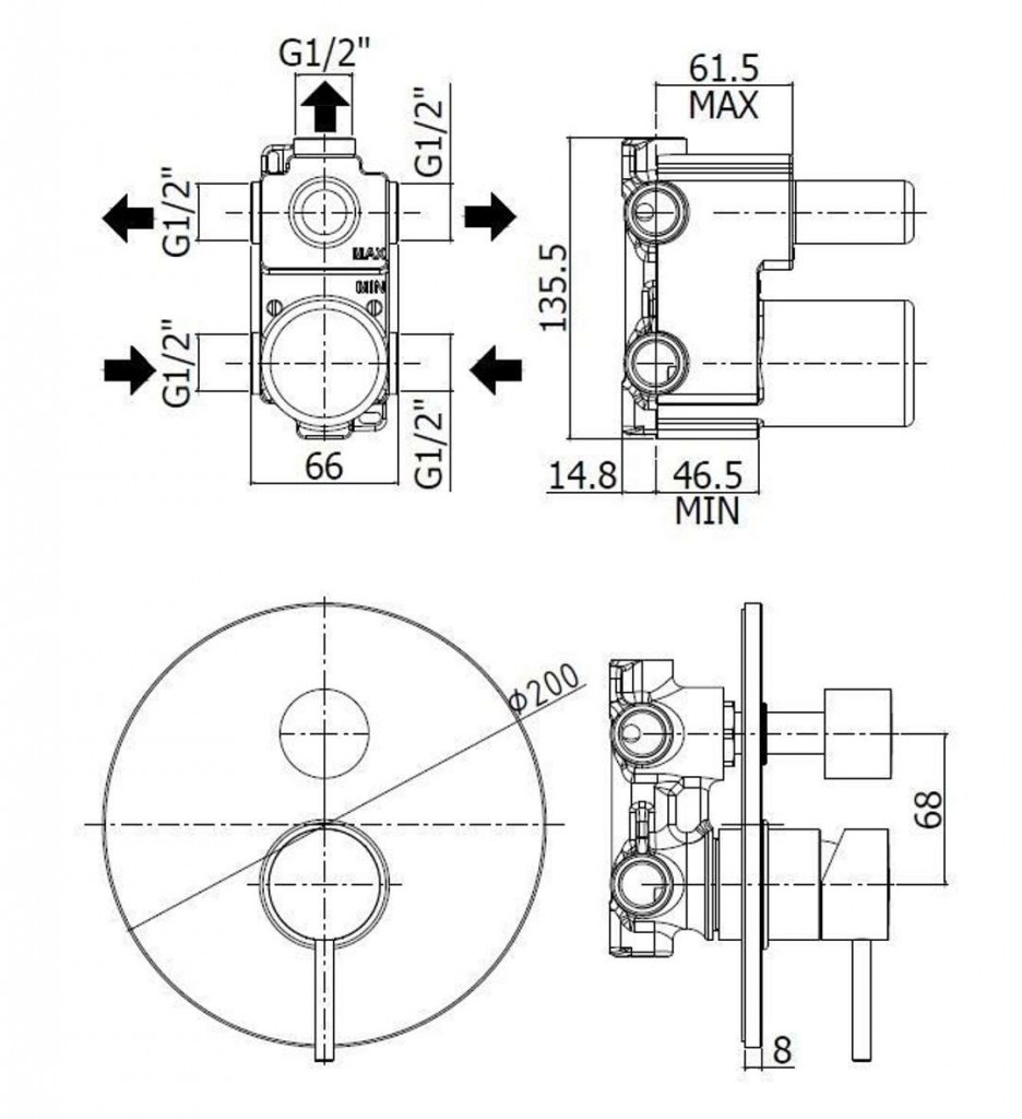 Sprchová páková batéria s otočným prepínačom vrátane podomietkového telesa pre 3 vývody