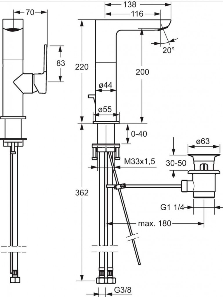 - pripojenie tlakovej hadice G 3/8