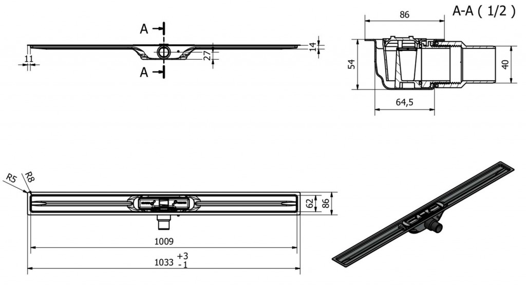 Stavebná výška žľabu PRO SS Linear 54 je vhodná na renovačné riešenie aj pre nové budovy. Sprchový rošt môže byť napojený pomocou priameho alebo 90° pripojovacieho dielu.