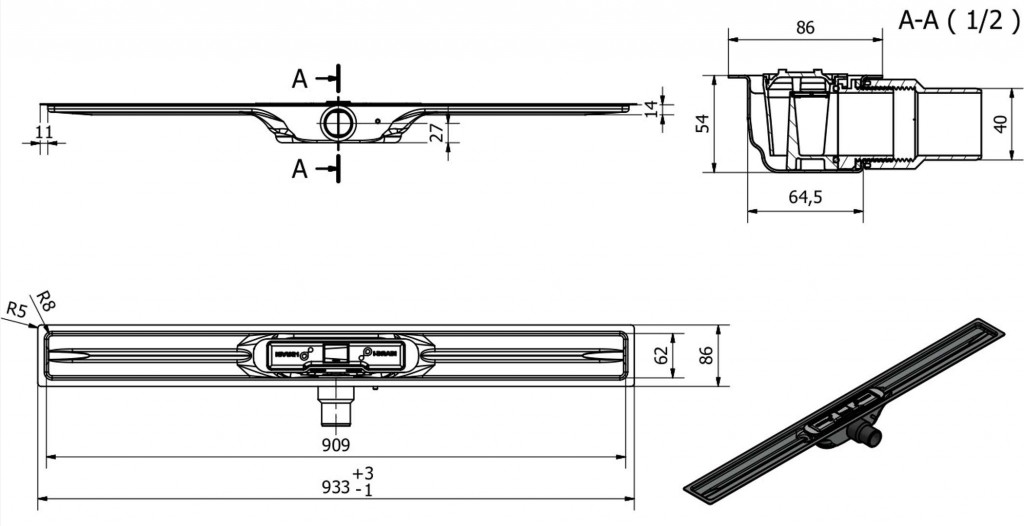 Stavebná výška žľabu PRO SS Linear 54 je vhodná na renovačné riešenie aj pre nové budovy. Sprchový rošt môže byť napojený pomocou priameho alebo 90° pripojovacieho dielu.