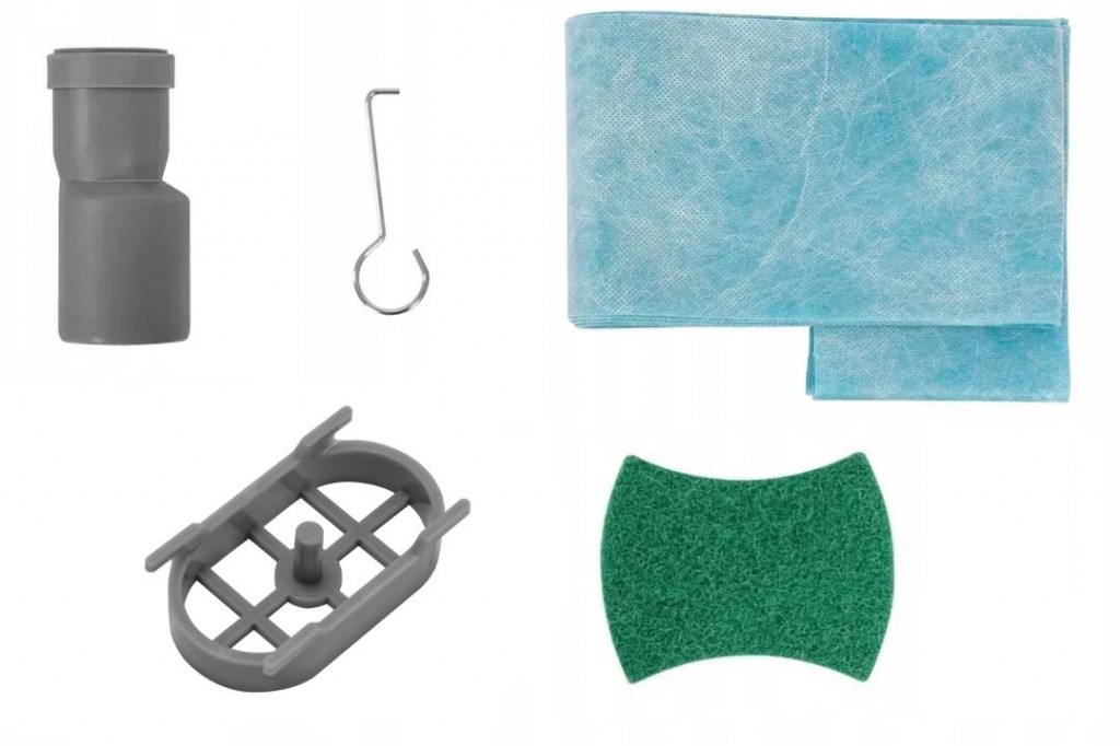 V komplete nájdete: maskovací profil, plastový sifón, tesniacu prírubu, vyrovnávacie nožičky, plastové stabilizátory roštu.