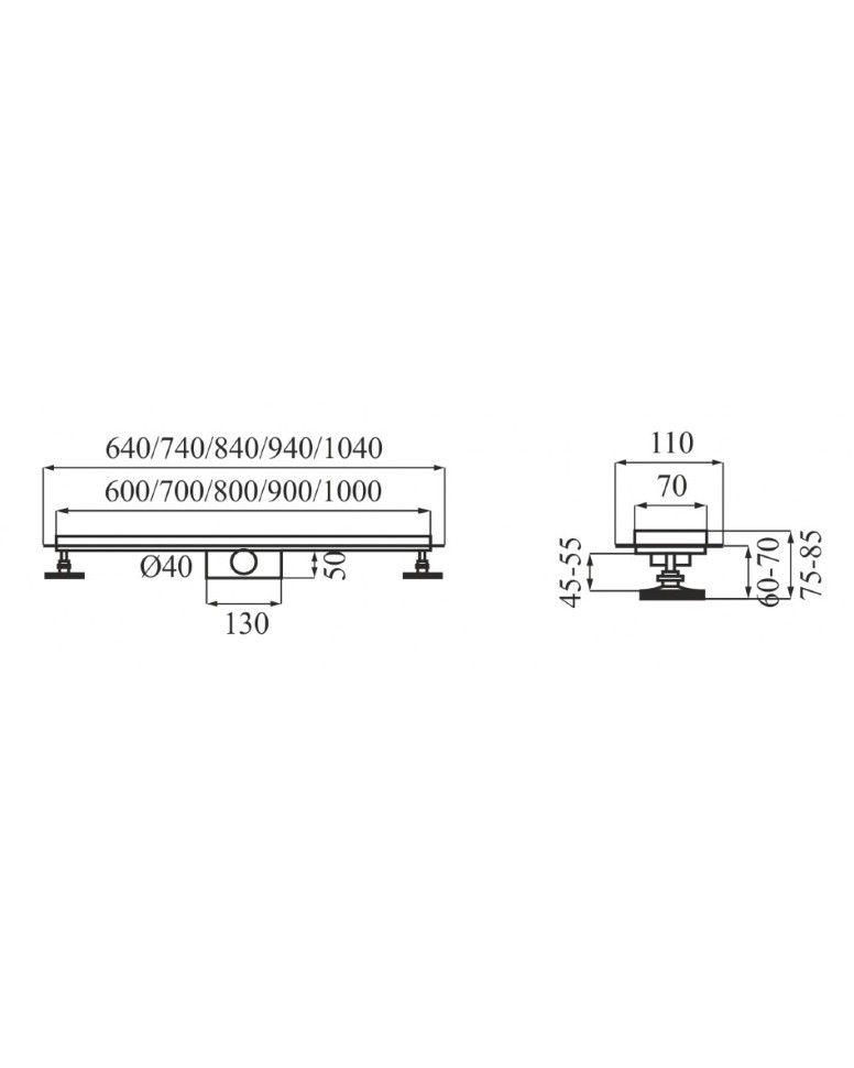 Odtokový žľab je vyrobený z nerezovej ocele AISI 304 s hrúbkou 1,2 - 1,5 mm mm, jeho súčasti je tiež vrchná dekoratívna nerezová mriežka s hrúbkou 1,5 mm ktorá je odolná proti veľkému zaťaženiu a poškriabaniu. Ďalšími výhodami tohto žľabu je vynikajúci odtok ( až 36 litrov za minútu) s možnosťou otočenia 360 st. a to aj pri silnom prúde vody. Jednoduchá je aj inštalácia a to vďaka nízkej montážnej výške (len 60-70 mm). Inštalačné nožičky odtokového žľabu umožňujú široký rozsah nastavenia výšky. Ľahko vyberateľný sifón je vybavený filtrom na lapanie nečistôt a protizápachovou prepážkou .