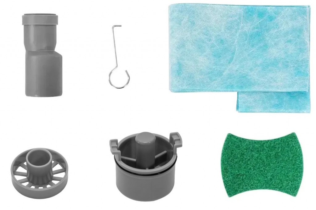 Sada obsahuje: nožičky, sifón, rošt, návod a háčik na výmenu masky.